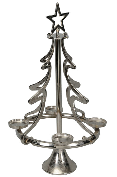 Stimmungsvoll dekorativer Tannenbaum als Silhouette aus silberfarbenem Aluminium mit Baum und 4 Teelichthaltern