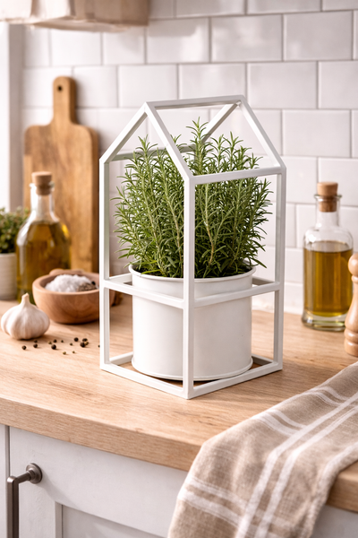 Integrierte Pflanztöpfe: Drei Metall-Töpfe bieten Platz für Kräuter, Sukkulenten oder kleine Blumenarrangements.