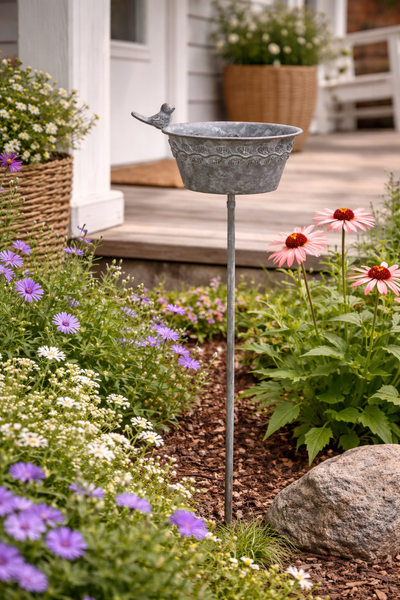 Nutzen Sie den Gartenstab in den kalten Monaten als Futterschale und im Sommer als Vogeltränke, oder Vogelbad.