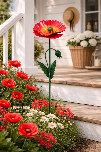 Dekorativer Gartenstecker – Metall-Blume im Mohn-Design in kräftigem Rot