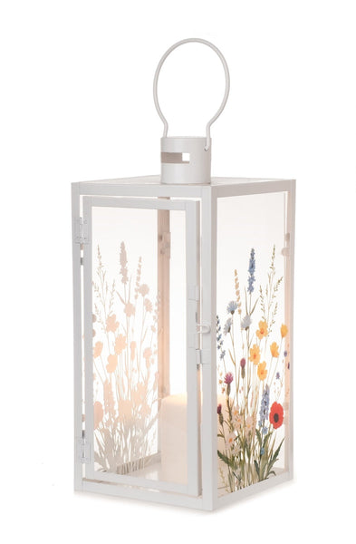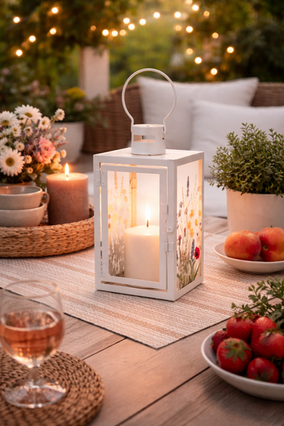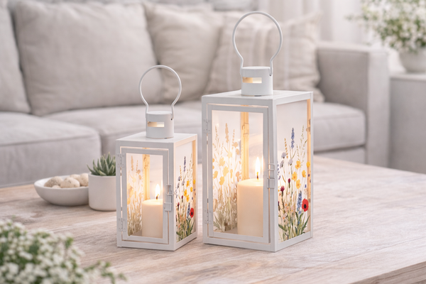 Diese elegante Metall-Laterne mit zartem Blütenmotiv bringt eine warme und stilvolle Atmosphäre in Ihr Zuhause und Ihren Außenbereich. Der weiße Metallrahmen in Kombination mit den liebevoll gestalteten Glasflächen sorgt für ein harmonisches Lichtspiel und eine zeitlose Optik.