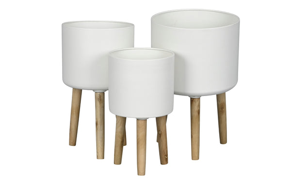 Zeitloses Design: Weiß lackierte Metalltöpfe kombiniert mit natürlichen Holzfüßen